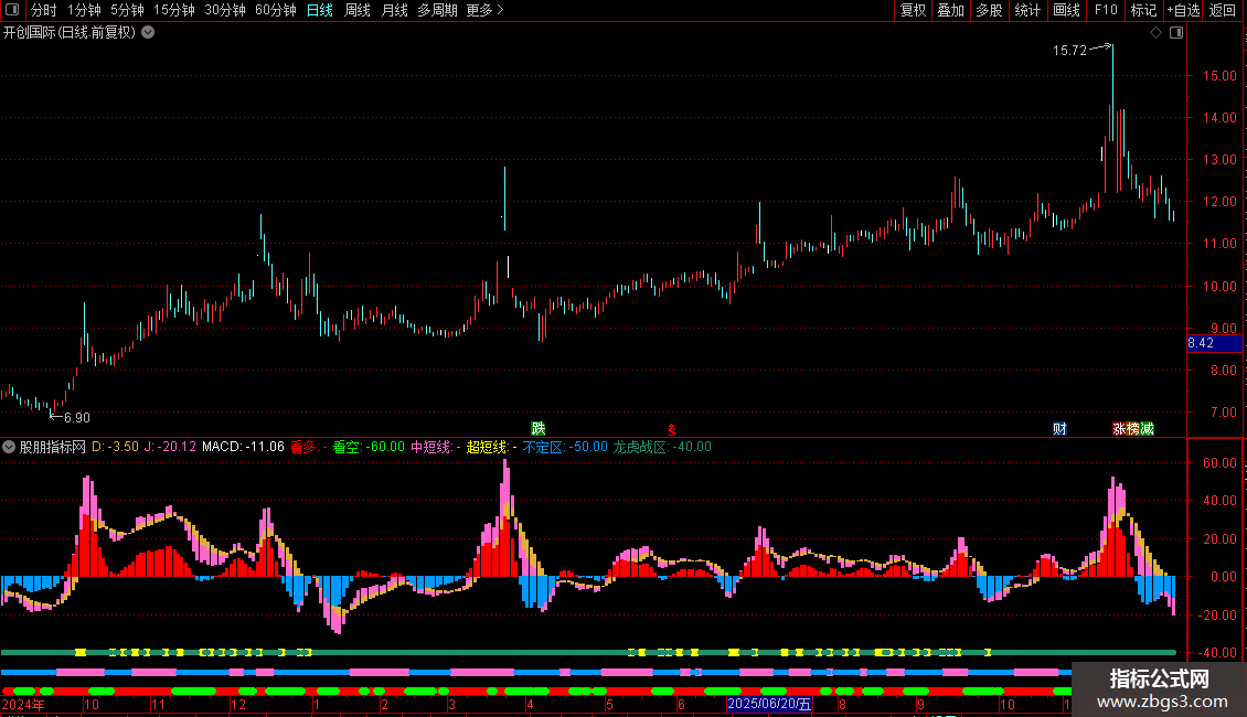 中短线:IF(J>D,-50,DRAWNULL),LINETHICK7,COLORCC66FF;