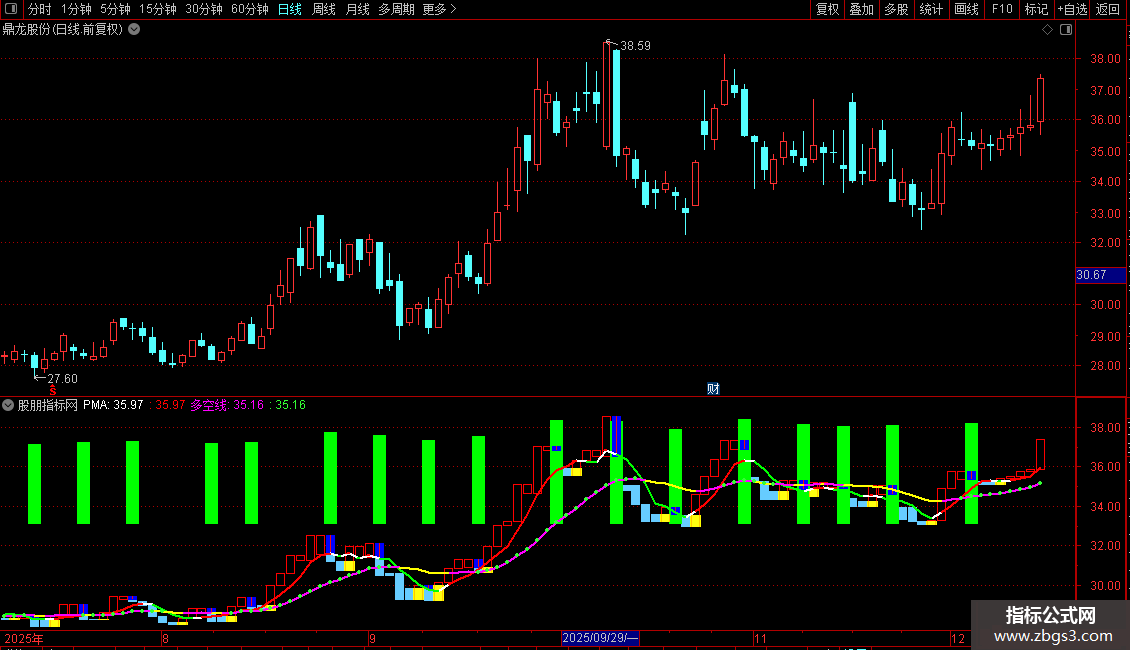 IF(A,多空线,DRAWNULL),COLOR33FF33,POINTDOT,LINETHICK4;