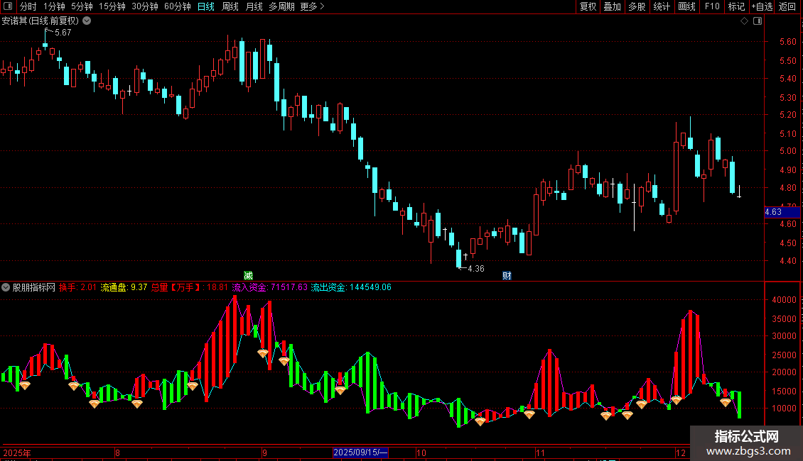 STICKLINE(流入资金>流出资金,流入资金,流出资金,1.6,0),COLORRED;