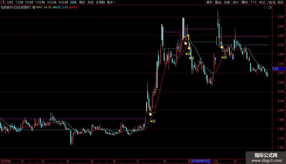 最后涨停距今数:BARSLAST(ZBGS3),NODRAW,COLOR00CCCC;