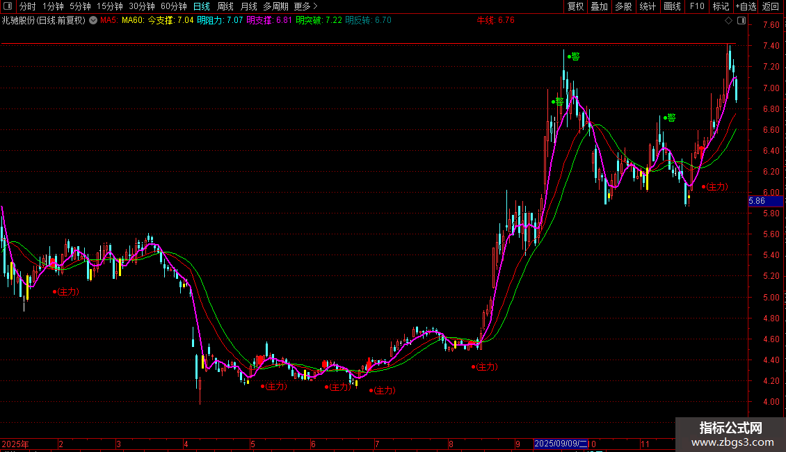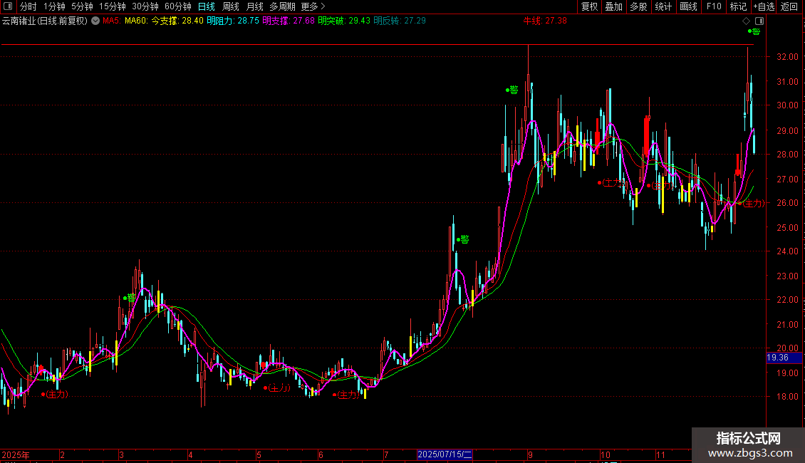 N:=5;E:=(HIGH+LOW+OPEN+2*CLOSE)/5;AAA:=2*E-LOW,NODRAW;AB:=2*E-HIGH,NODRAW;ACC:=E+(HIGH-LOW),NODRAW;ADD:=E-(HIGH-LOW),NODRAW;今阻力:REF(AAA,1),COLORWHITE,NODRAW;今支撑:REF(AB,1),COLORYELLOW,NODRAW;明阻力:AAA,COLORCYAN,NODRAW;明支撑:AB,COLORMAGENTA,NODRAW;明突破:ACC,COLORGREEN,NODRAW;明反转:ADD,COLORLICYAN,NODRAW;{压力+支撑}压力:MA(REF(HHV(C,30),1),2),COLORBLACK;支撑:MA(REF(LLV(C,30),1),2),COLORBLACK;