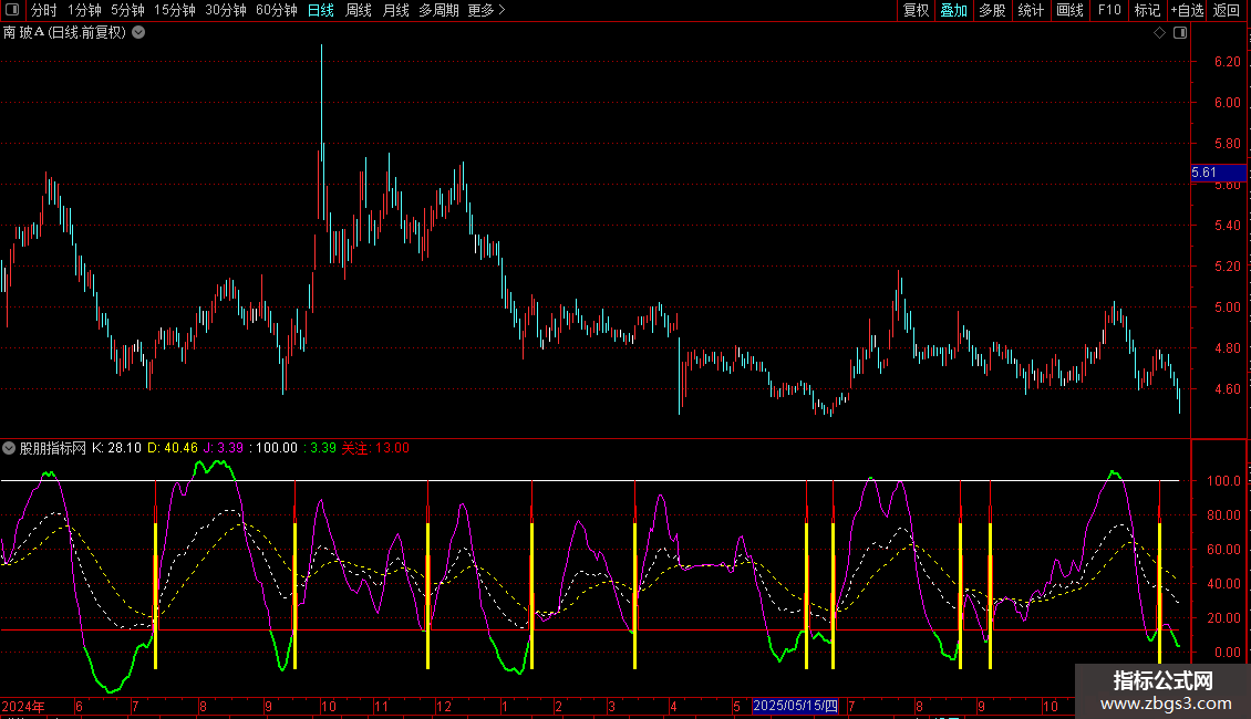 关注:IF(CROSS(J,N)AND CCI>-100,100,N),COLORRED;
