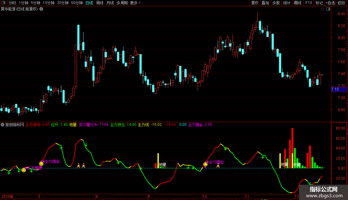 指标通过价格波动、成交量结构与多周期动量,综合判断主力资金是否正在低位吸筹或启动拉升。当股价处于相对低位、出现缩量企稳且主力资金线由负转正并上穿其均线时,系统标记为“主力掘金”信号,提示潜在的启动机会;同时结合地量和超卖状态辅助确认底部区域。操作上可在信号初现时分批布局,配合主力持仓强度和趋势过滤,适合中短线捕捉主力介入初期的个股。