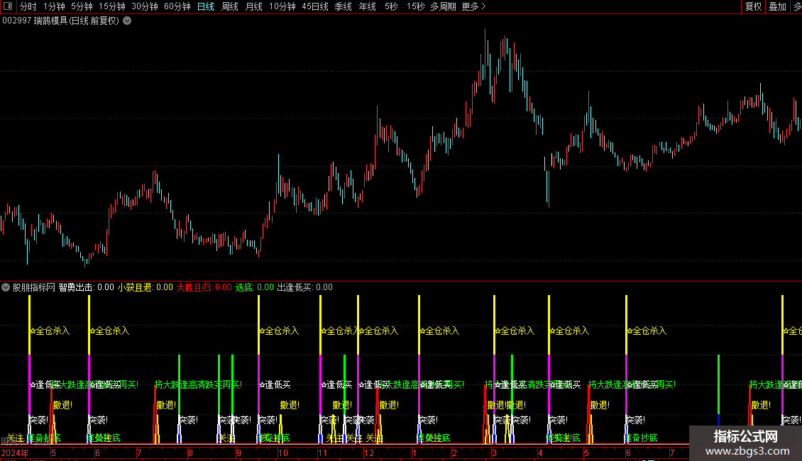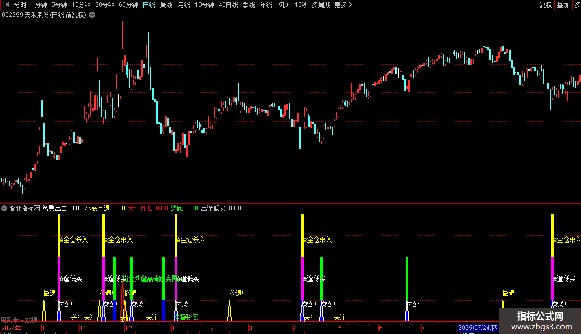 1. **买入信号**:出现“☆全仓杀入”(多周期ZIG共振金叉+下跌反转)、“突袭!”(短期趋势拐头向上)、“准备抄底”(底部拐点临近)或“☆逢低买”(ZIG金叉)时,可结合K线形态确认进场;