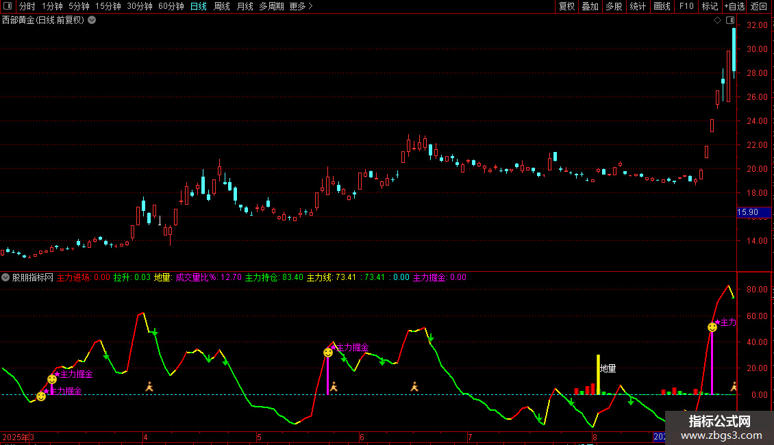 当满足条件主力掘金时,在0和主力线位置之间画柱状线,宽度为1,0不为0则画空心柱.,COLORFF00FF