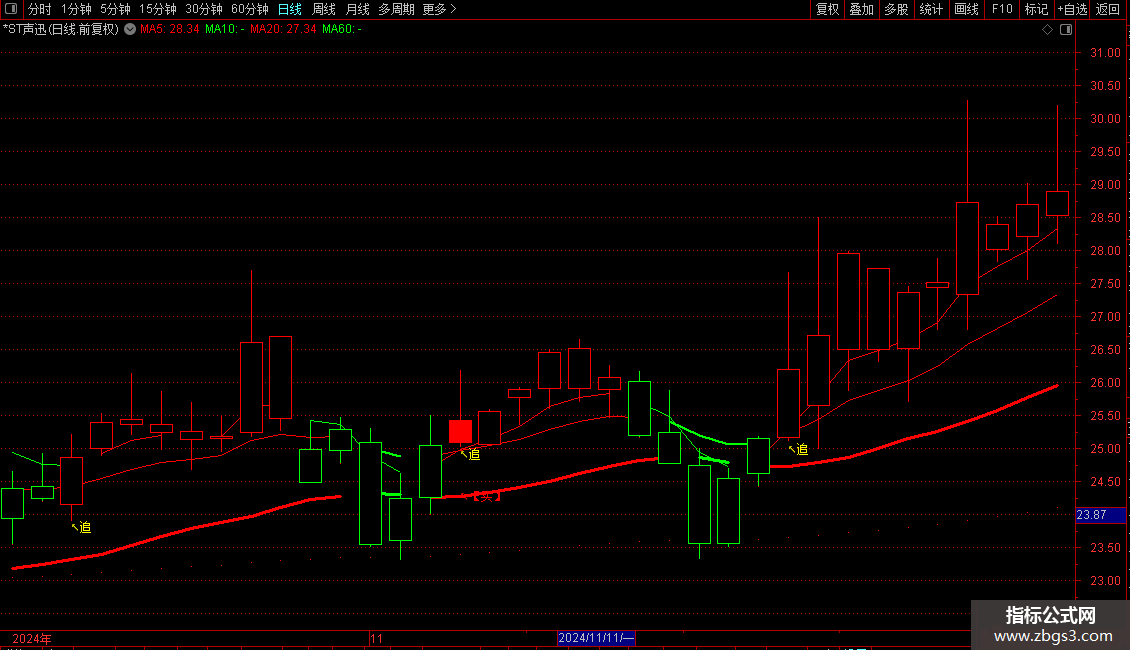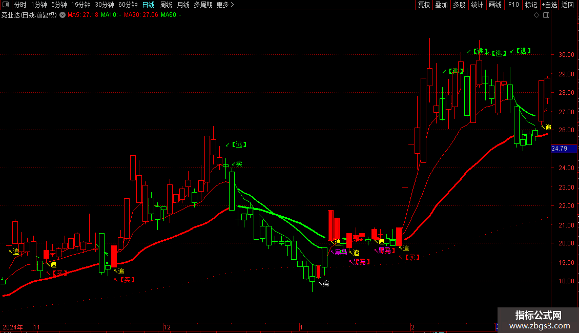 DRAWTEXT(CROSS(BF3,AF3) AND H>中中顶 AND H>中顶,H*1.03,'↙【逃】'),COLORGREEN;