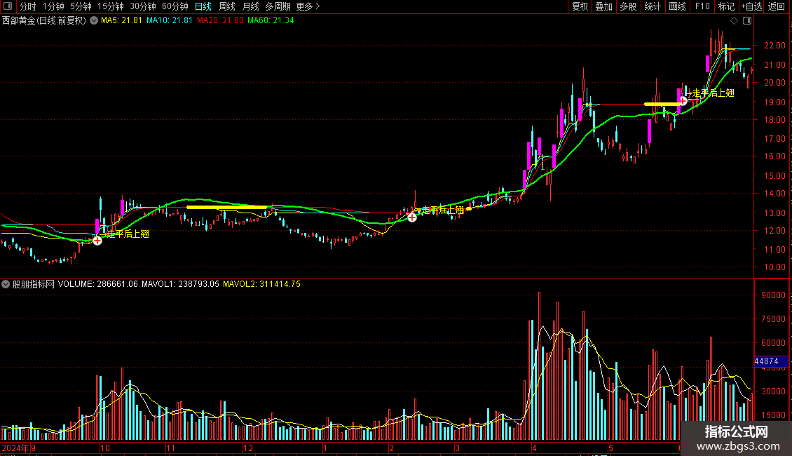 DRAWTEXT(CROSS(VAR4,VAR5) AND C>VAR7,LOW*1.01,' →走平后上翘'),COLORYELLOW;