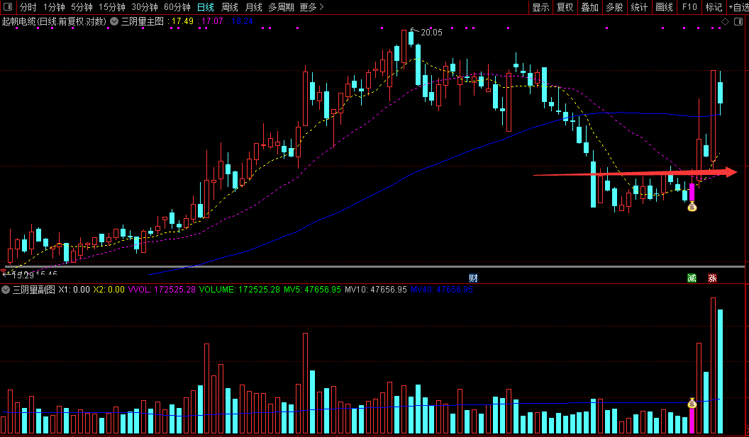 1. 连续出现三根逐级缩量的阴量线,缩量结束后指标会发出“钱袋子”买入信号。