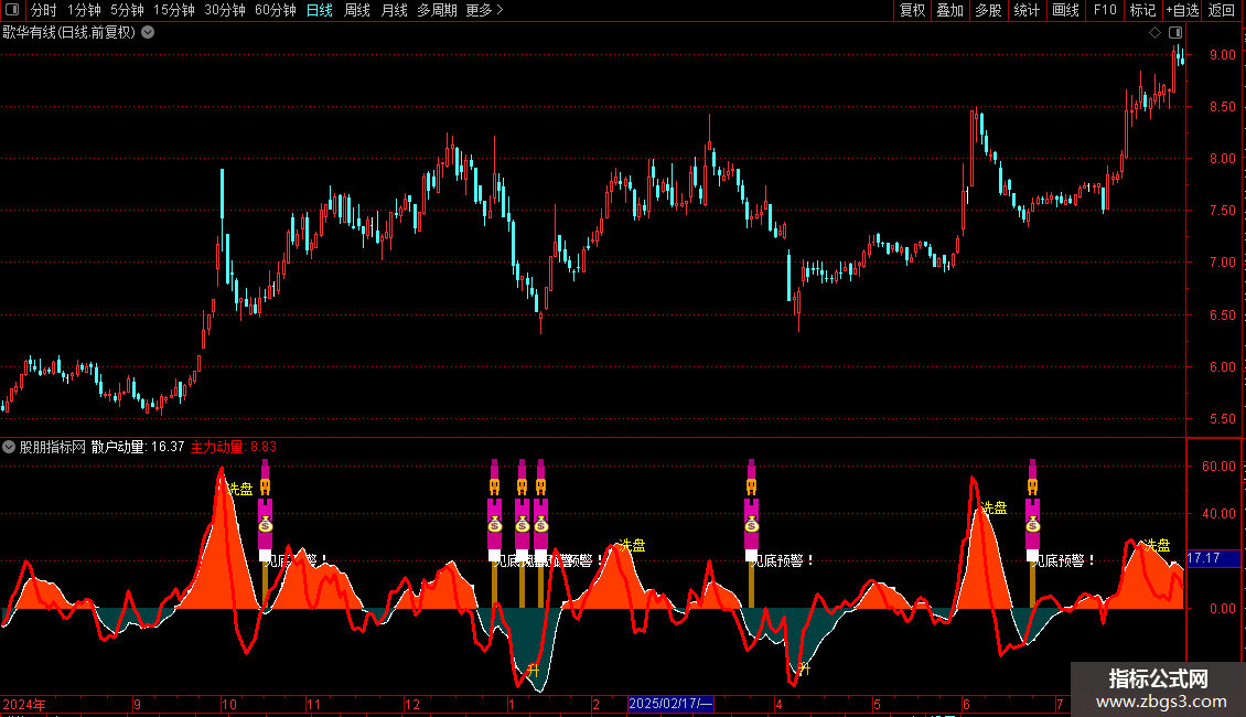 指标融合了随机指标(KDJ)变体、动量对比和相对强弱判断,用于捕捉潜在底部启动机会。通过监测短期价格在近期高低区间中的位置,结合长期与短期均线关系,识别“见底预警”信号。同时,利用散户与主力动量的背离与金叉,判断资金流向变化:当主力动量上穿散户动量且处于低位时,视为上涨启动;若叠加动量回升或极端低位,则触发买入提示。整体策略侧重于在市场情绪低迷、主力悄然介入时提前布局。