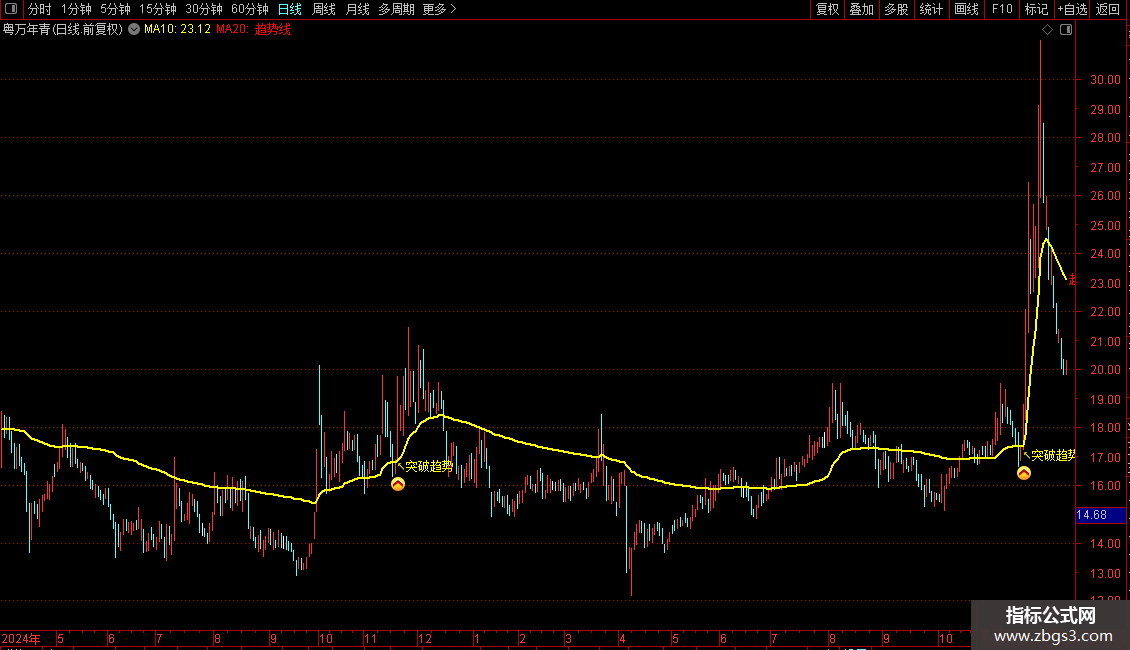 DRAWTEXT(突破信号,L*0.99,'↖突破趋势'),COLORYELLOW;