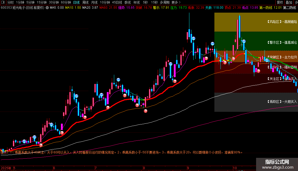 DRAWTEXT(CURRBARSCOUNT=N/4+5,GD-KJ*0.3,'【警示区】--逢高减仓'),COLORFFFFFF;