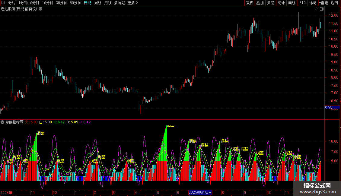 DRAWTEXT(REF(火,3)>0 AND REF(火,2)>0 AND REF(火,1)>0 AND 火=0 AND REF(火,1)>山,REF(火,1),'调整'),COLORYELLOW , ;