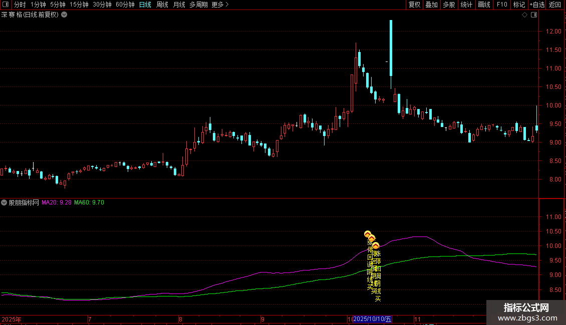 MA10:=MA(C,10)COLORYELLOW;