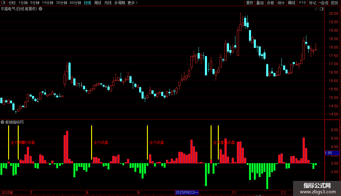 指标通过价格与短期均线的偏离程度构建“主力筹码”能量柱,用红绿颜色区分多空力量,并结合多条平滑均线捕捉主力资金异动。当主力筹码处于低位且出现特定交叉、持续弱势后快速回升等组合条件时,判定为潜在底部区域,触发“主力买盘”信号,提示可能的反弹机会。操作上适合在信号出现时结合市场环境轻仓试多,尤其关注超跌后的反转时机。