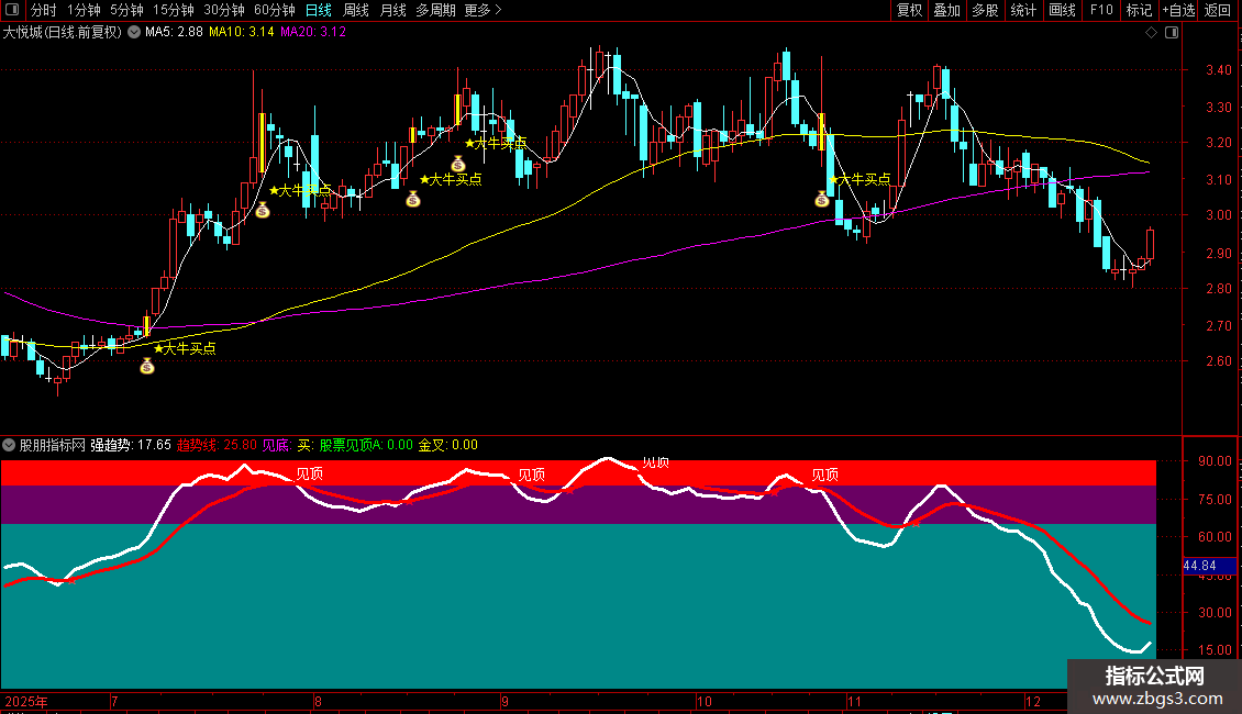 金叉:IF(CROSS(强趋势,趋势线)&&趋势线< 60,趋势线,0),NODRAW,COLORYELLOW;