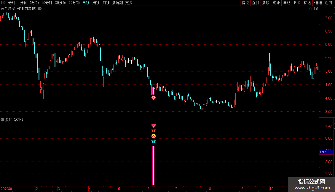 当满足核心条件时,公式会以粉黄双色K线+底部预警图标发出明确信号,辨识度极高。