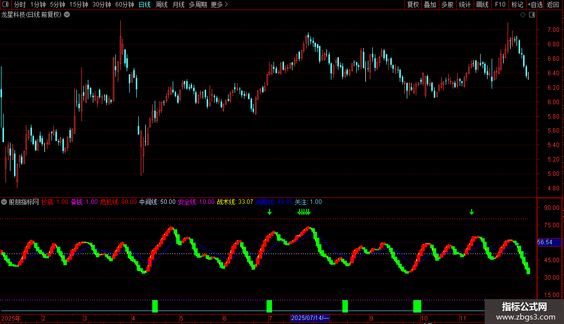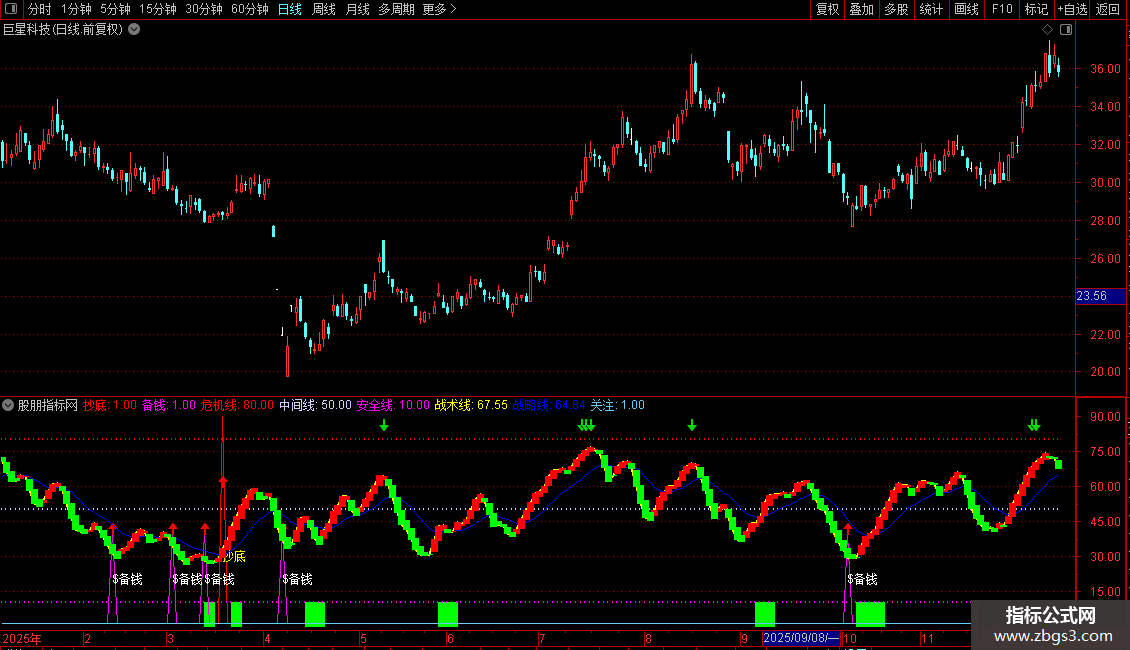 短线逃顶:=IF(I,0,1),COLORGREEN;