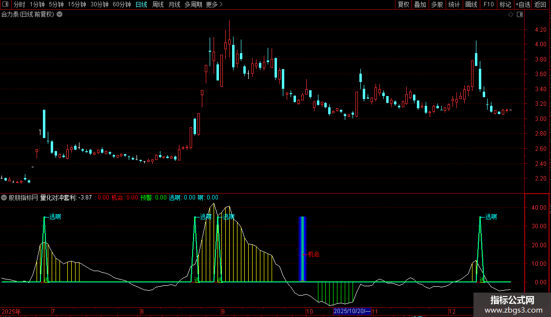 一旦出现“逃”或“←逃啊”提示,配合黄色超买柱,应果断减仓或离场。