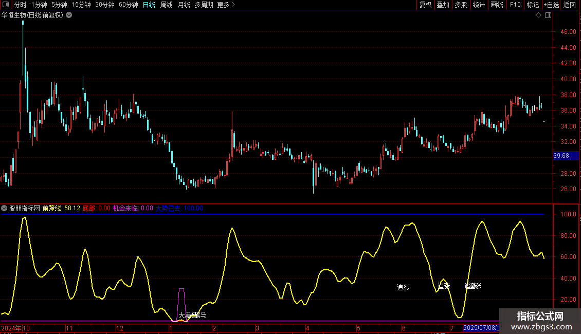 DRAWTEXT(CROSS(黑马线,A5)AND 前蹄线<80,黑马线,'追涨');