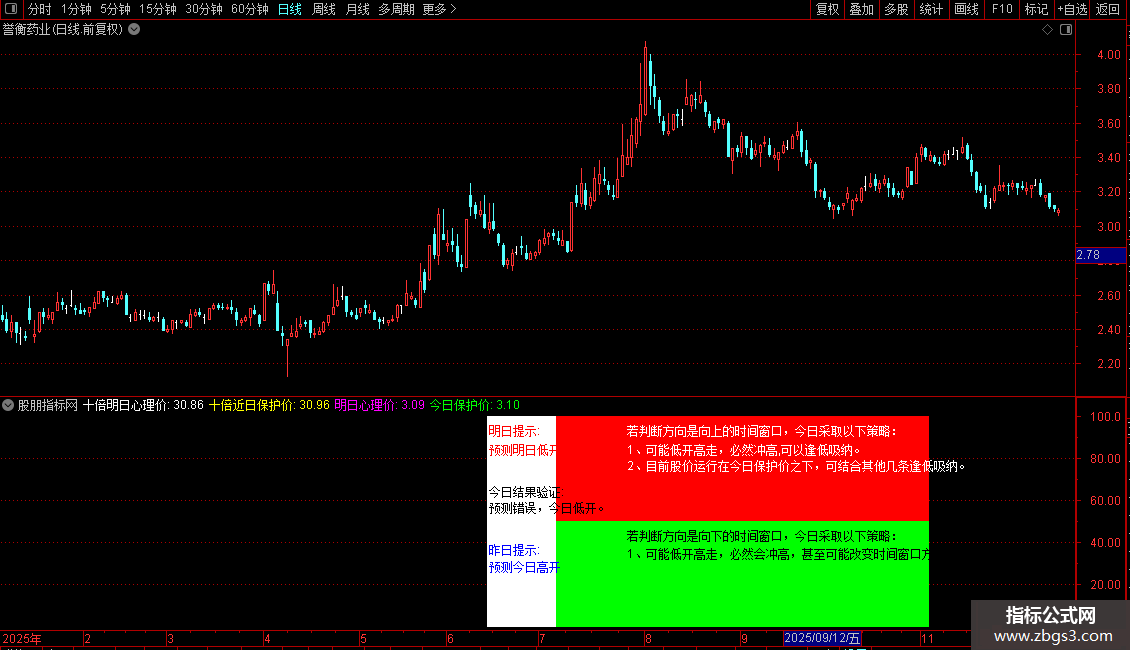 {DRAWTEXT( CONST(IF(DYNAINFO(7)>今日保护价,1,0))=1 AND CURRBARSCOUNT=95,26,'2、目前股价运行在今日保护价之上,不宜追涨。'),COLORBLACK;