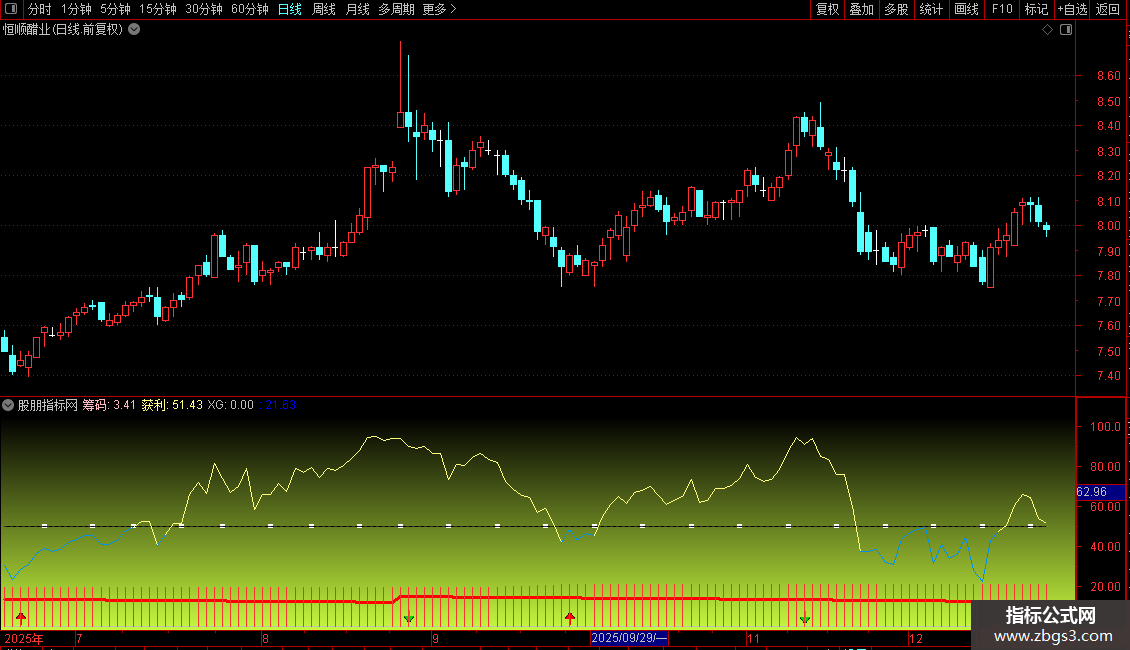 指标主要结合筹码分布、价格位置、均线系统和量价关系,用于判断市场强弱与潜在买卖点。通过分析成本集中度与获利盘比例,识别主力控盘程度;同时利用多周期均线、支撑压力线及特殊K线形态,辅助捕捉低位反弹或突破机会。当出现黄色柱状标记或“3成仓”提示时,视为阶段性低吸信号,适合轻仓介入;而ZIG转向图标则提示短期趋势拐点,可用于波段操作参考。