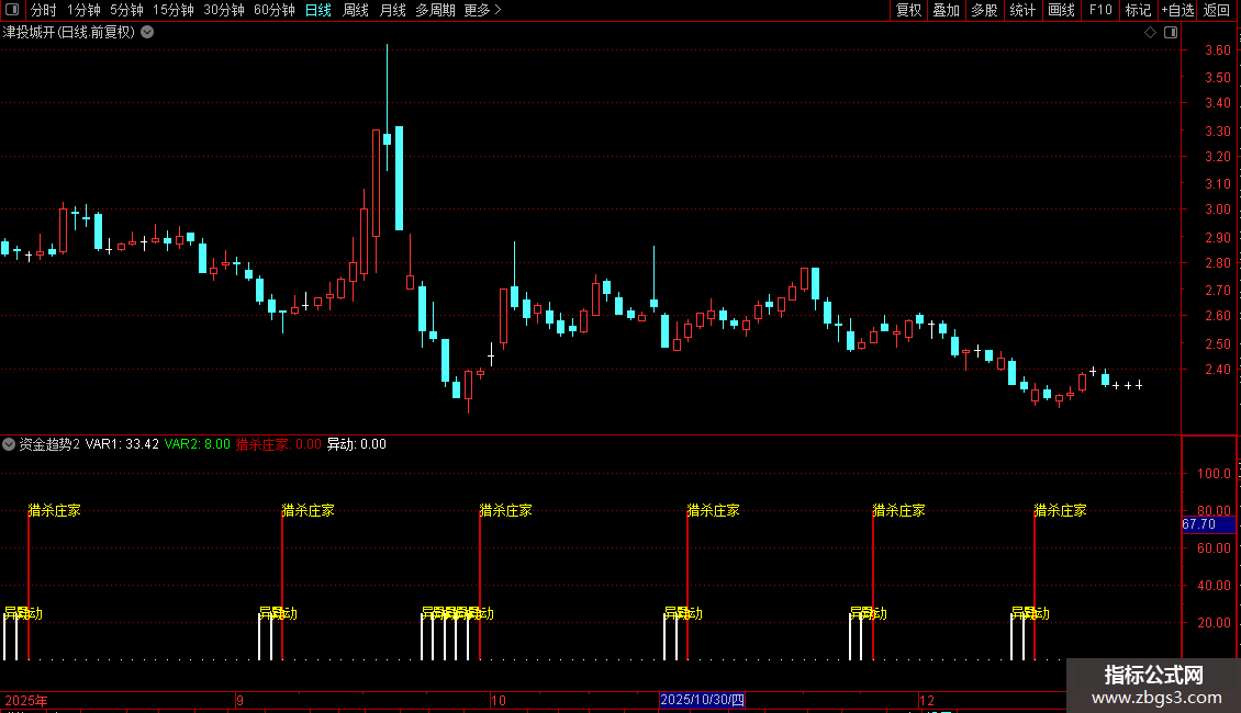 指标通过比较股价在近期高低点区间中的相对位置,构建出两条平滑曲线,用以捕捉短期价格动能的变化。当快线向上突破预设阈值时,视为强势信号,提示“猎杀庄家”;当指标回落至低位区域,则标记为“异动”,暗示市场可能出现异常波动或主力动作。整体策略偏向短线交易,适用于震荡或启动初期的行情识别。