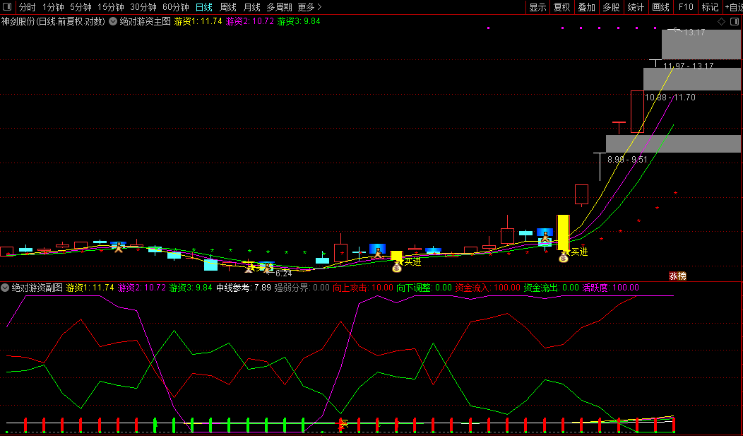 通达信【绝对游资】主副/选通过游资线捕捉价格短期波动状态源码