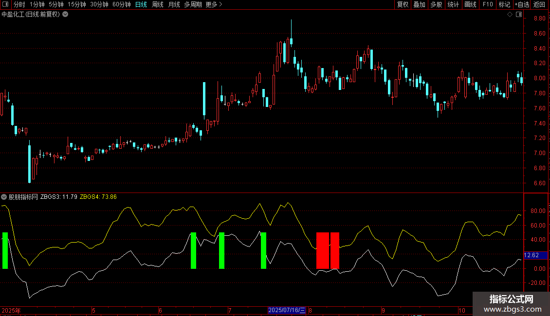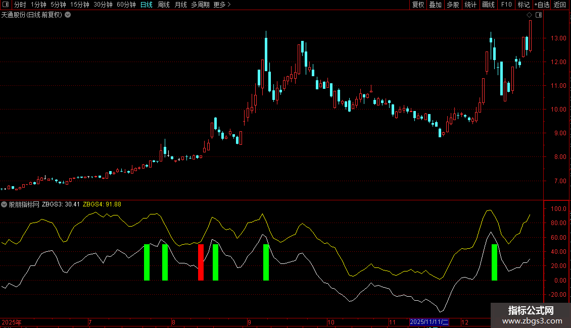 • 买入信号:出现彩色柱状图时,表明符合多项技术买入条件