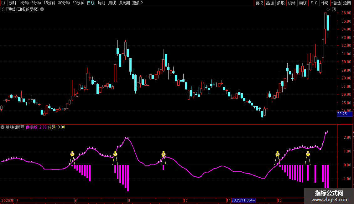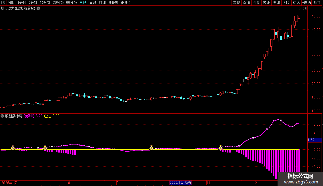 指标通过融合价格、成交量与资金成本,构建出多空趋势判断体系。核心逻辑是利用加权均价与指数移动平均的差值,识别主力资金动向及市场强弱。当指标显示“做多线”上行且主力强度柱状图出现时,视为多头信号;若个股价格显著高于其13日平均持仓成本,则判定为主力介入,发出“庄进”提示。策略上,投资者可结合“做多线”方向与“庄进”信号,择机布局强势股。