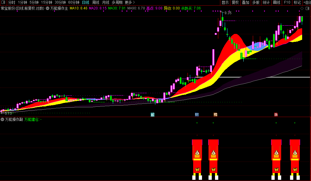副图指标核心为捕捉强势股启动点。当股价经历短期整理后,在趋势、量能、价格强度均满足条件时,主图会在K线下方显示红色的“元宝”文字及图标信号,提示潜在买入时机。该信号结合了价格动量突破、成交量放大以及均线多头排列等多重过滤条件,旨在识别可能开始主升浪的个股。