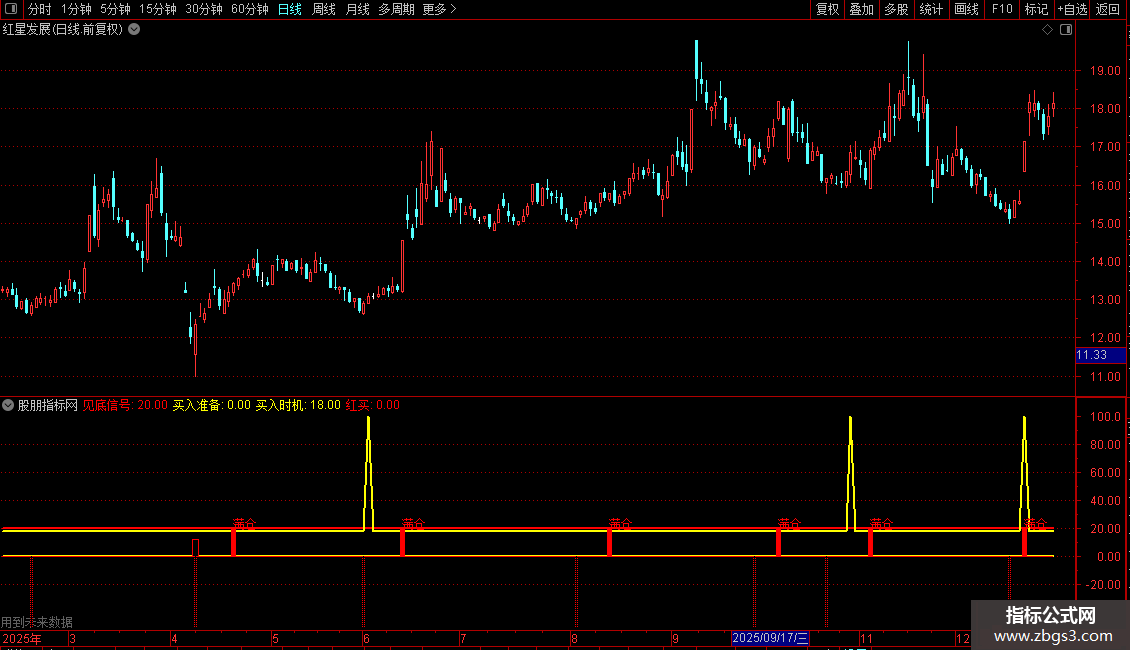 买入时机: IF(CROSS(主力,见底信号),100,18),LINETHICK2,COLORYELLOW;