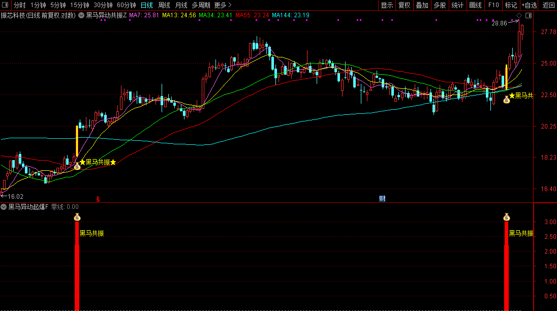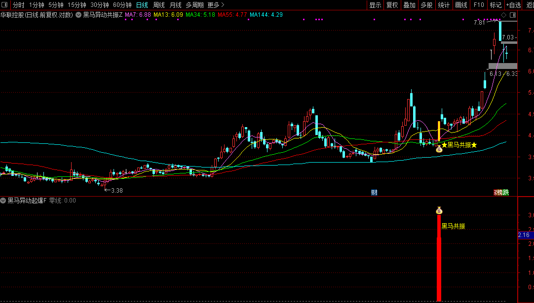 本指标是黑马形态异动 + 资金量能加速双条件共振选股共振结合, 7/13/34/55/144 日线,实战均线系统 的综合主图指标,将强势个股的形态筛选、资金动能、趋势支撑三者完美结合。指标核心逻辑为:通过多维度量价形态筛选出具备「黑马启动特征」的个股,叠加资金量能强势拉升的加速确认,形成双重共振买入信号;同时配套实战级均线系统判断个股趋势方向,信号以纯黄色系高亮标记在主图 K 线中,信号醒目不遮挡 K 线、均线,兼顾选股精准度与看盘舒适度,是波段强势股筛选的实战型指标。