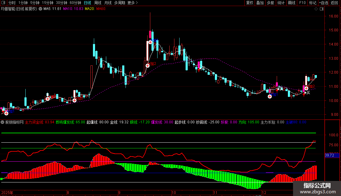 3、当“主力资金”上行到“即将爆发区域”时--加仓,主图上显示“加2”信号标识;信号可选股;