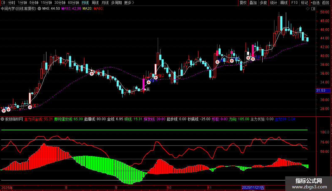 2、副图第一次出现“红色柱子”时--加仓,主图上显示“加1”信号标识;信号可选股;