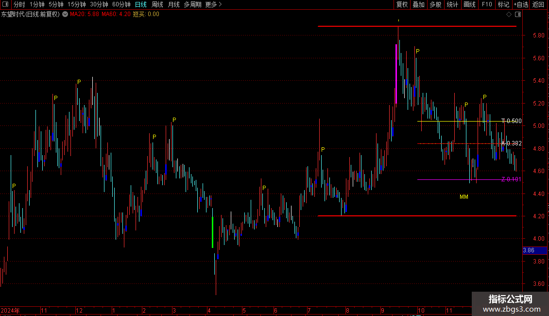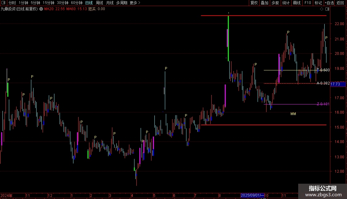 指标主要用于识别价格极端波动和潜在的反转机会。通过标记涨停与跌停K线,直观显示市场情绪;同时结合长期高低点构建斐波那契关键位,辅助判断支撑与压力区域。此外,利用ZIG之字转向函数捕捉不同周期的趋势拐点,并配合连续小K线组合识别短期底部,形成“短买”信号。整体策略偏重于在价格超跌或趋势转折时寻找入场点,高位则提示离场。