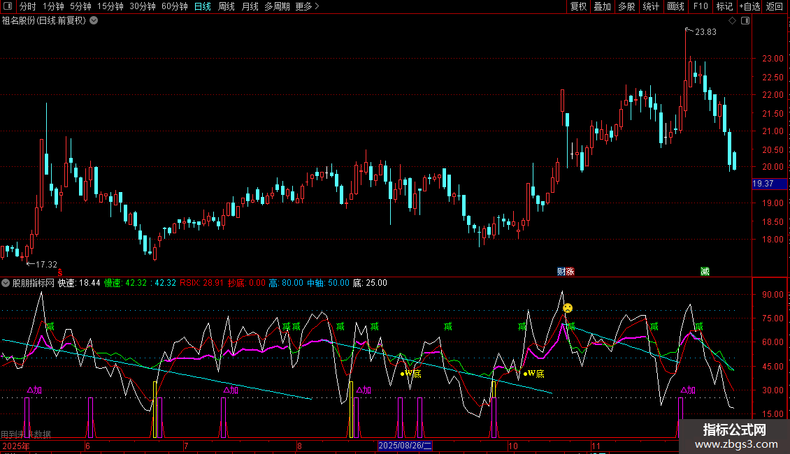W底1:=COUNT( CROSS(快速,25),15)>=2 AND 抄底=20;