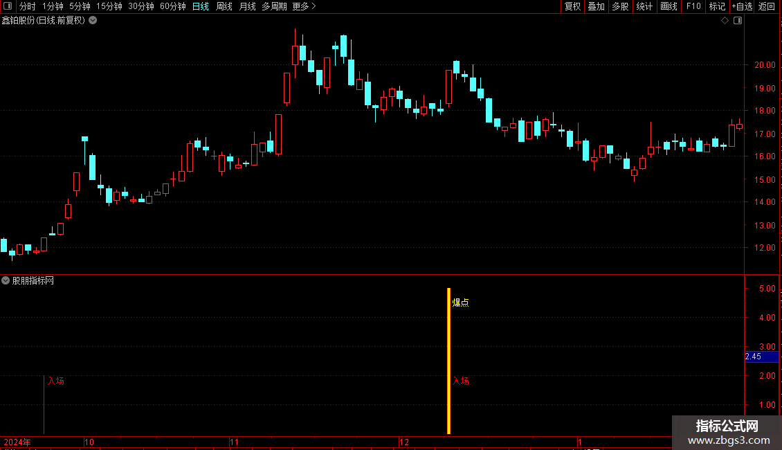 通达信爆点入场指标是一款专为捕捉强势股突破信号设计的技术分析工具,它通过价格与通道的共振关系生成直观的买卖信号。该指标主要包含两个有效信号:入场信号与爆点信号。当价格突破支撑线(红色细线)且收盘价站上压力线(黄色线)时触发入场信号;当价格以涨停板形式强势突破压力线时,则触发更为强烈的爆点信号,并在图中以彩色柱状图突出显示。