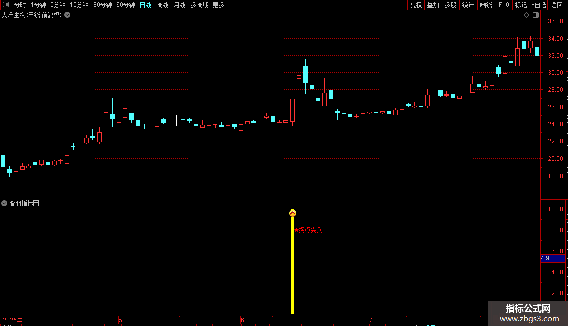指标旨在捕捉股价在经历调整后出现的早期反转信号,称为“拐点尖兵”。通过结合价格相对强度、成交量放大程度、短期均线多头排列以及资金流变化,筛选出具备强势启动特征的个股。当价格突破关键均线系统、量能明显放大且动量指标形成金叉时,发出买入提示,适用于短线或波段介入。