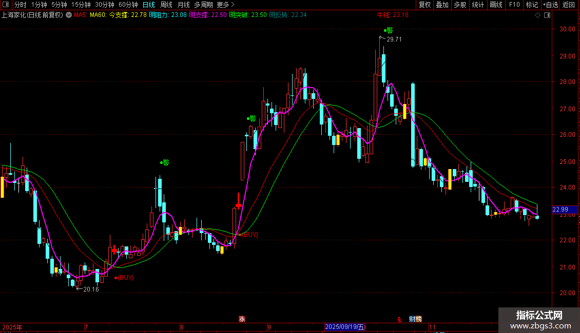 N:=5;E:=(HIGH+LOW+OPEN+2*CLOSE)/5;AAA:=2*E-LOW,NODRAW;AB:=2*E-HIGH,NODRAW;ACC:=E+(HIGH-LOW),NODRAW;ADD:=E-(HIGH-LOW),NODRAW;今阻力:REF(AAA,1),COLORWHITE,NODRAW;今支撑:REF(AB,1),COLORYELLOW,NODRAW;明阻力:AAA,COLORCYAN,NODRAW;明支撑:AB,COLORMAGENTA,NODRAW;明突破:ACC,COLORGREEN,NODRAW;明反转:ADD,COLORLICYAN,NODRAW;{压力+支撑}压力:MA(REF(HHV(C,30),1),2),COLORBLACK;支撑:MA(REF(LLV(C,30),1),2),COLORBLACK;