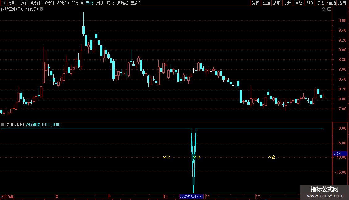 指标基于MACD构建,主要识别特定形态的“W底”反转信号。其核心逻辑是:当DIFF在零轴下方上穿DEA形成金叉,并结合DEA由正转负的背景,系统会累计符合条件的金叉次数;一旦累计次数比历史最高值多出两次,且当前次数较前一日增加,即触发选股信号。此时在图上标记“W底”字样并输出固定数值提示。操作上,投资者可将此作为潜在底部反弹的参考依据,配合其他确认信号择机介入。