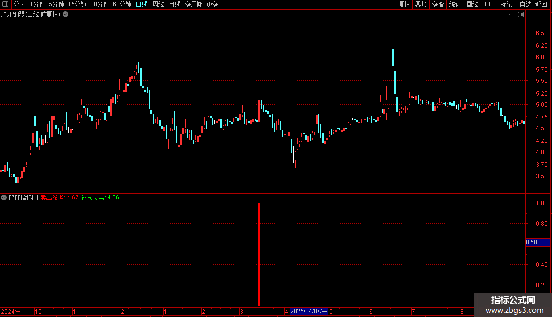 指标主要帮助识别股票短期顶部和底部,提供卖出和补仓参考。通过计算最高价和最低价的移动平均值来设定卖出和补仓的价格参考线,并结合价格突破、相对强弱指标变化等条件判断买入时机。特别地,当市场出现连续弱势后首次强势反转时,会发出明确的买入信号,以蓝色柱状图显示,辅助投资者捕捉短线反弹机会。
