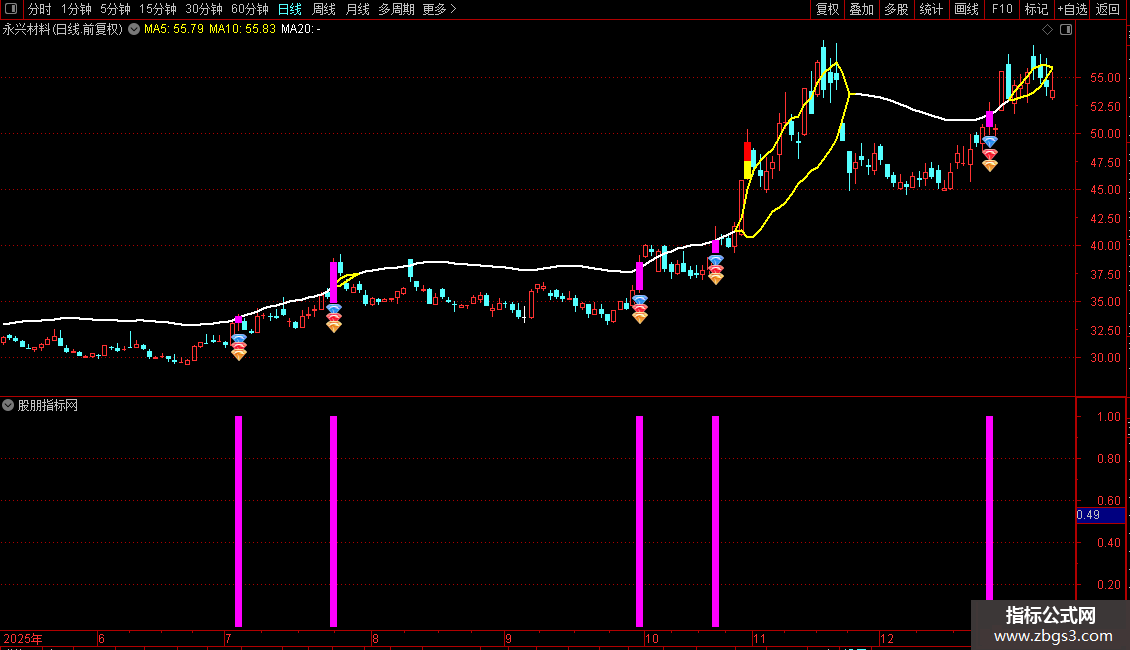 1. 信号识别:当K线下方出现三颗钻石图标且收盘价站上下轨(P5)时,为关键买入信号