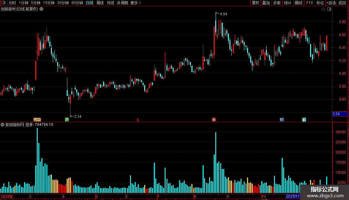 输出TDXSTEP458:当满足条件K<30时,在总手和0位置之间画柱状线,宽度为2.5,0不为0则画空心柱.,COLOR000065