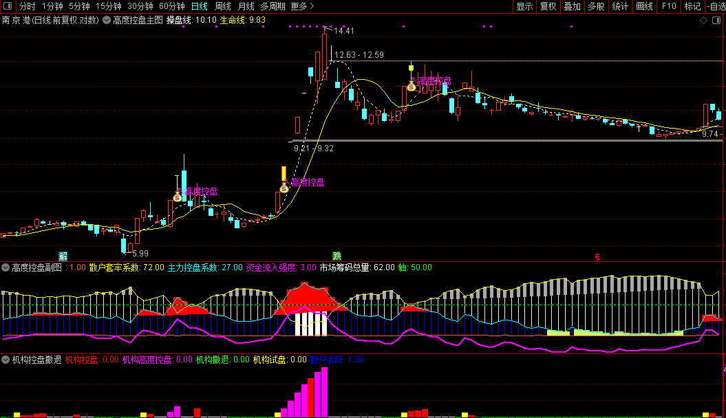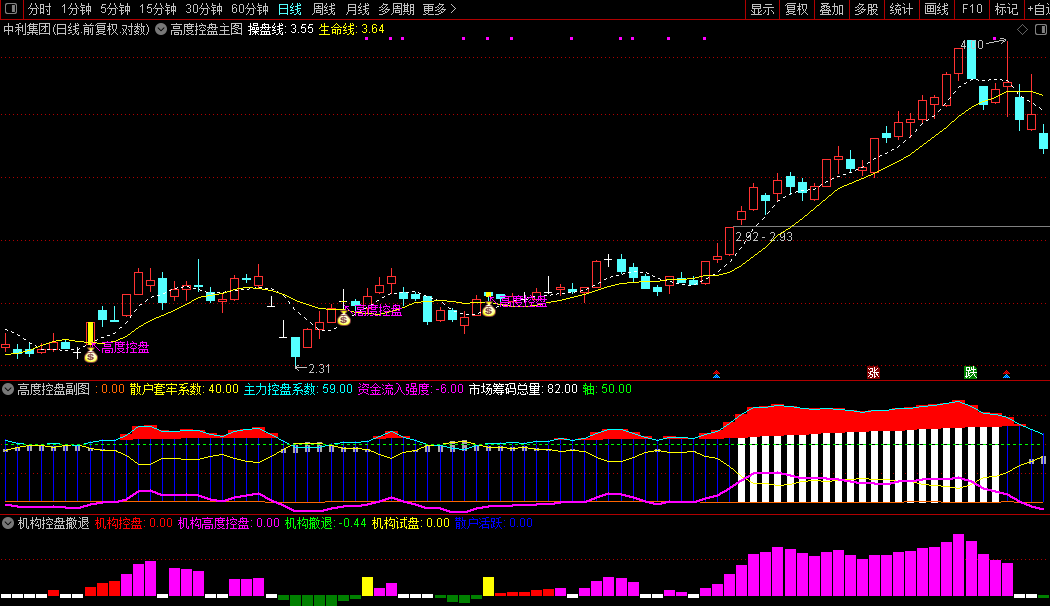 主图出“钱袋子”高度控盘信号后,在操盘线(白色虚线)上持有;