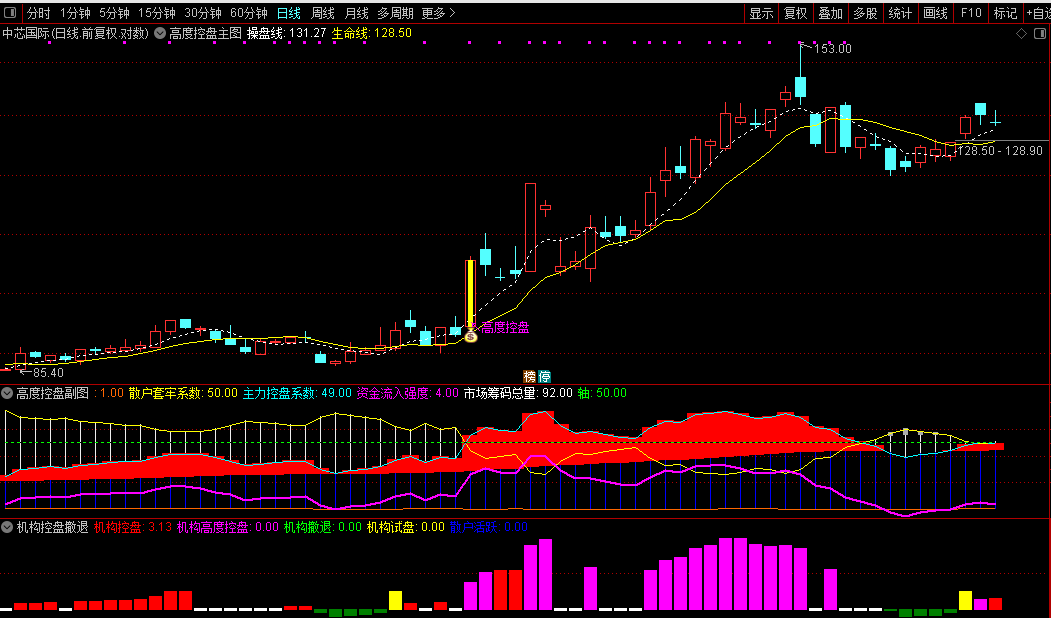本指标包括1主、2副,1选股公式。根据主力控盘筹码比例,资金流入强度,计算出主力筹码控盘系数,当上穿“中心轴线”时为主力“高度控盘
