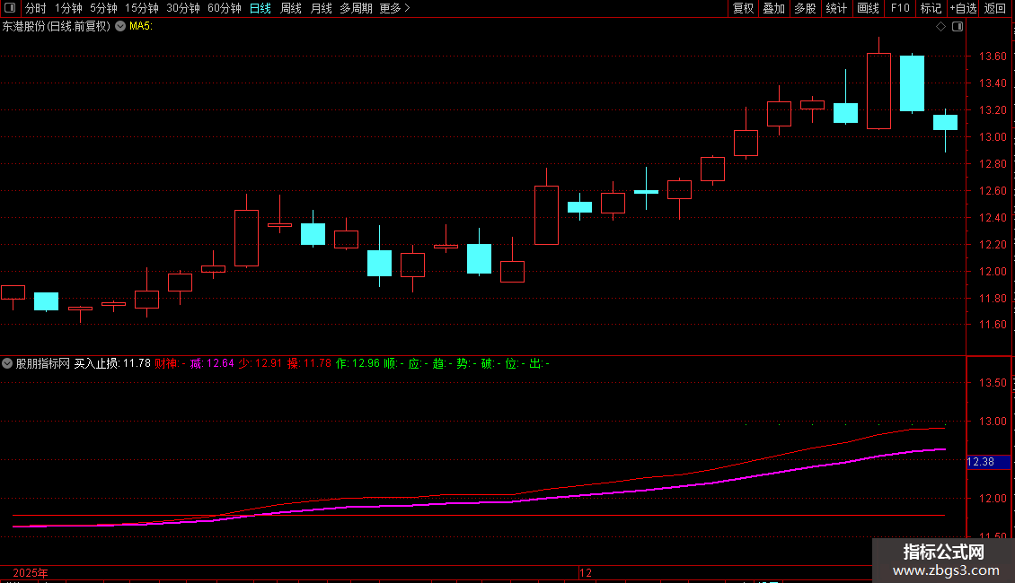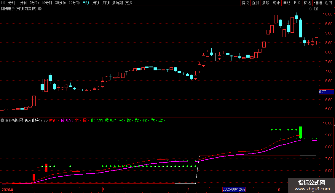 A0:=(L+H+C*2)/4;工作:=EMA(A0,14)COLORYELLOW,LINETHICK1;度假:=EMA(A0,25)COLORYELLOW,LINETHICK2;A1X:=(工作-REF(工作,1))/REF(工作,1)*100;A2X:=(度假-REF(度假,1))/REF(度假,1)*100;G:=BARSLAST(CROSS(A1X,0));买入止损:REF(A0,G),COLORWHITE,LINETHICK1;A2:=3*EMA((C-LLV(L,30))/(HHV(H,30)-LLV(L,30))*100,5)-2*EMA((C-LLV(L,30))/(HHV(H,30)-LLV(L,30))*100,5);A4:=(HHV(H,34)-C)/(HHV(H,34)-LLV(L,34))*100;A5:=EMA(CLOSE,12)-EMA(CLOSE,26);A6:=EMA(A5,9);A7:=(A5< -0.1 AND A5>A6);财神:IF(A7,LLV(L,21),DRAWNULL)COLORRED,CIRCLEDOT;DRAWICON(CROSS(A2,EMA(A2,5)) AND (A4-EMA(A2,5))>40 AND A7,LLV(L,21)*1.02,1);STICKLINE(C>REF(C,1)*1.09,C,O,2,0)COLORRED,LINETHICK2;STICKLINE(C< REF(C,1)*0.901,C,O,2,0)COLORGREEN,LINETHICK1;减:IF(A2X>=0,度假,DRAWNULL),COLORMAGENTA,LINETHICK2;少:IF(A1X>=0,工作,DRAWNULL),COLORRED,LINETHICK1;操:IF(A1X>=0,买入止损,DRAWNULL),LINETHICK1,COLORRED;作:IF(H>=REF(A0,BARSLAST(CROSS(A1X,0)))*1.1,REF(A0,BARSLAST(CROSS(A1X,0)))*1.1,DRAWNULL),COLORGREEN,POINTDOT;顺:IF(H>=REF(A0,BARSLAST(CROSS(A1X,0)))*1.2,REF(A0,BARSLAST(CROSS(A1X,0)))*1.2,DRAWNULL),COLORGREEN,POINTDOT;应:IF(H>=REF(A0,BARSLAST(CROSS(A1X,0)))*1.3,REF(A0,BARSLAST(CROSS(A1X,0)))*1.3,DRAWNULL),COLORGREEN,CIRCLEDOT;趋:IF(H>=REF(A0,BARSLAST(CROSS(A1X,0)))*1.4,REF(A0,BARSLAST(CROSS(A1X,0)))*1.4,DRAWNULL),COLORGREEN,POINTDOT;势:IF(H>=REF(A0,BARSLAST(CROSS(A1X,0)))*1.5,REF(A0,BARSLAST(CROSS(A1X,0)))*1.5,DRAWNULL),COLORGREEN,POINTDOT;破:IF(H>=REF(A0,BARSLAST(CROSS(A1X,0)))*1.6,REF(A0,BARSLAST(CROSS(A1X,0)))*1.6,DRAWNULL),COLORGREEN,POINTDOT;位:IF(H>=REF(A0,BARSLAST(CROSS(A1X,0)))*1.7,REF(A0,BARSLAST(CROSS(A1X,0)))*1.7,DRAWNULL),COLORGREEN,POINTDOT;出:IF(H>=REF(A0,BARSLAST(CROSS(A1X,0)))*1.8,REF(A0,BARSLAST(CROSS(A1X,0)))*1.8,DRAWNULL),COLORGREEN,POINTDOT;