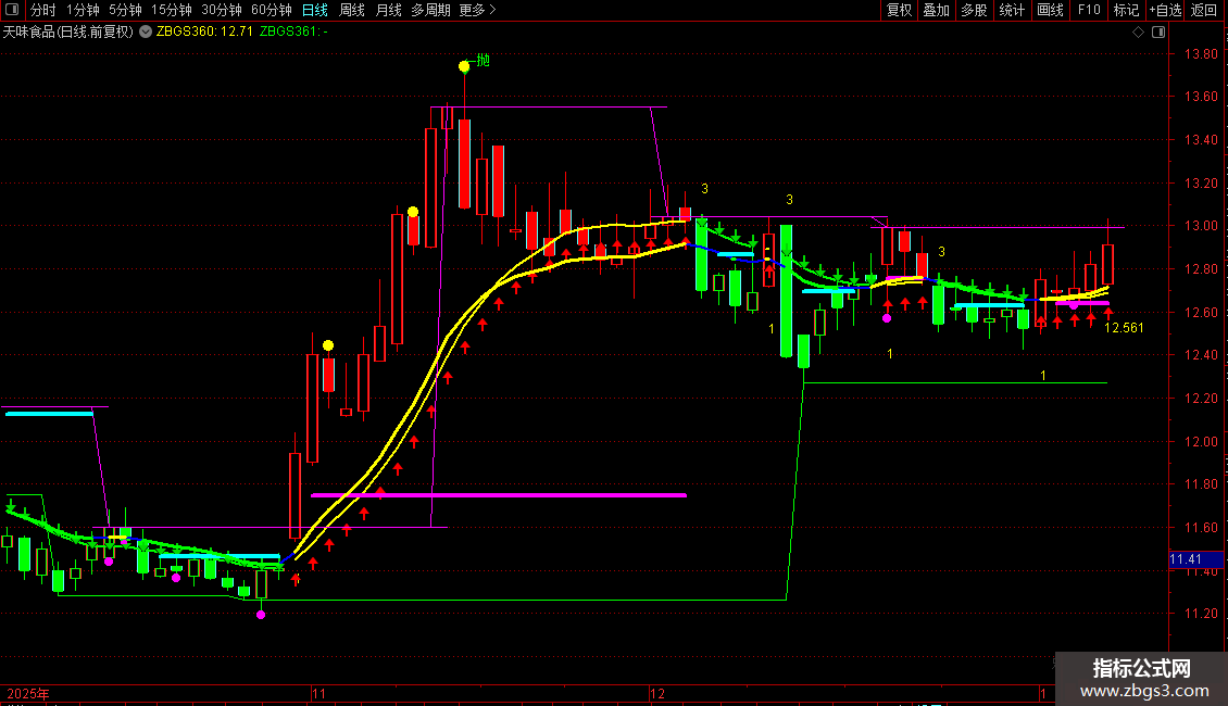 2. 公式自动在K线图右侧显示三组形态标识——分别对应短、中、长期;