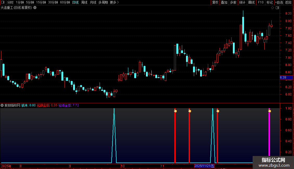 指标主要通过价格变动率和成交量变化的突增来识别潜在强势启动个股,当两者同时出现异常放大时,触发“钱来”信号,提示短期资金异动。此外,结合近期高点与低点结构,绘制出两条关键压力参考线——“起拔金指”和“秘线金指”,当股价向上突破任一参考线时,视为趋势转强的确认信号,适合短线介入。整体策略强调量价突变与关键位突破的双重验证。