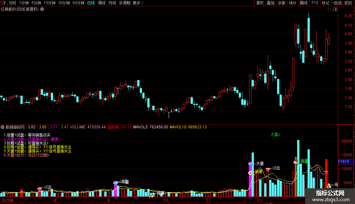 DRAWTEXT_FIX(C>O,0.01,0.33,0,'6.天量+拉升:当日/次日跑;'),COLORLIRED;