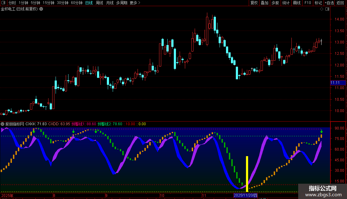 本策略依托CX1(红色)与CX2(黄色)指标线跟踪股价运行趋势,结合KD漂带指标(CXKK与CXDD线)清晰标识强弱区间,并设置0、10、78.6、88.6四条关键预警线。该系统提供明确的与交易信号:当CXKK线上穿10且其差值不超过1时,发出买入信号;持仓线超过88.6时,提示卖出预警。CXD1动能柱以红色上涨、绿色下跌直观反映动力强弱,适用于震荡行情中捕捉短线机会,也可用于筛选具备强势突破潜力的个股。